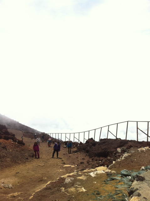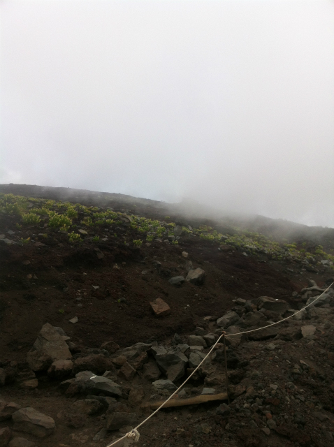 到着した駐車場もガスで曇っている。車は既に100台近く停まっていた。ここでこのガスだと上はどうなんだろう。バスは6時から運行開始だけどまだ5時半、スタートの混雑は嫌なのでリッチにタクシーをチャーター。登山道は道が狭くところどころで渋滞をおこすと書いてあったし、お盆のシーズンは更にそれが酷いとも書いてあった。だから少しでも早く出発したかったんです。五合目到着。ガスで真っ白・・。服は直ぐに濡れてしまうレベル。レインウエアーは持ってきていない。雨が降れば直ぐに帰るつもりだったし(←これダメです。登ってから分かりました。絶対持っていきましょう)風も強いし、気分は低め。とりあえず七合目まで行って考えようとスタート。