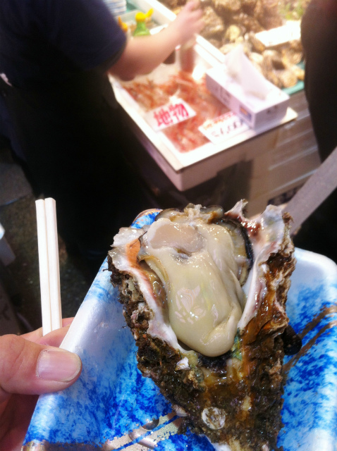 お寿司でおなかを七分目くらいにしておいて市場を歩きながら美味しそうなものを食べることにした。一個からどうぞ!と書いてある岩牡蠣。酢醤油でトゥルンって、はぁぁぁ幸せや・・。カニ海老など小皿での立ち食いがあるので、ついつい(^^)あーー美味しかった。