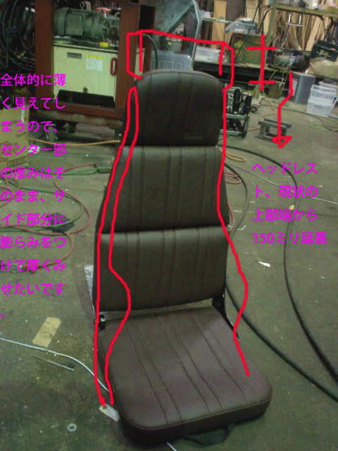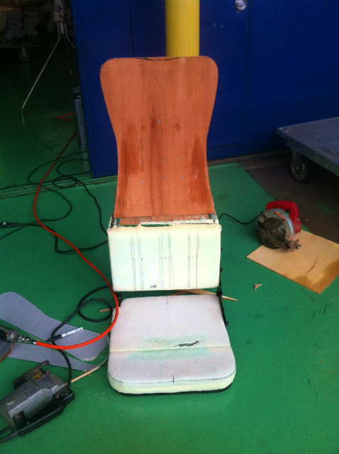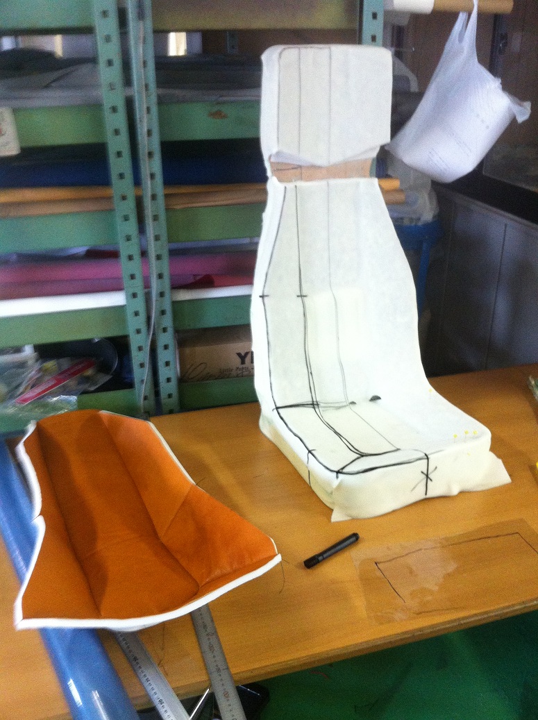 とりあえず前回現場で軽く打ち合わせた内容で作ってみた。薄くて、なんとなく戦闘機のシートをイメージしたつもりだったんですが・・・薄すぎます、シートの存在感がないです、ホールド性も悪いです・・・と、実際据え付けたことで倉田さんからの要望が見えてきた。要望なんて得てしてそんなもので、経験がないものを何もない状態から形や色をイメージすることは至難の業なんです。だから、一回目でそりゃぁ素晴らしい出来のシートができればいいが、上手くいかないのがだいたいのところ。だから、