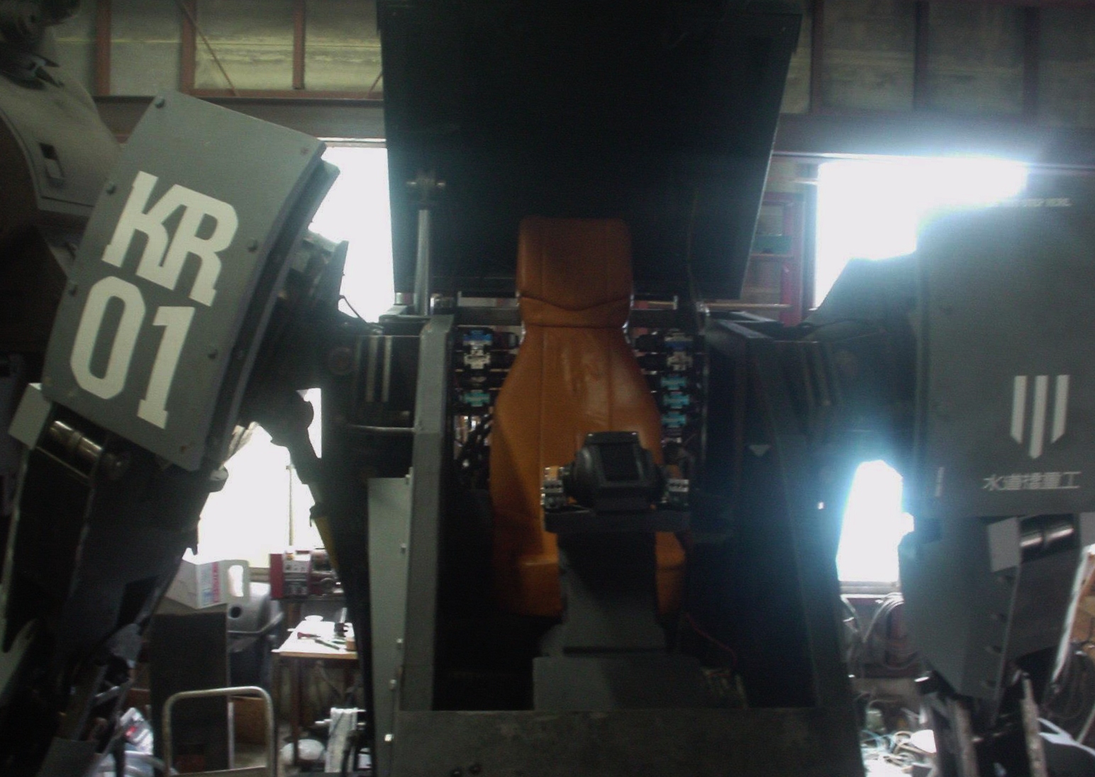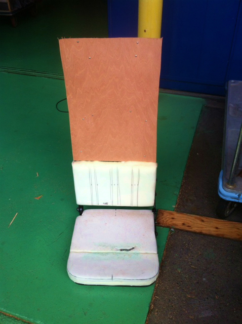 背のフレームにコンパネをつけてバックレストの高さを延長。写真で見るとバランスが悪い。シートだけではなく、取り付けるコクピット内には油圧系統のバルブやスイッチがたくさんあり、それらがシートに邪魔をすることも判明。だから、少し作業を進めて写真を撮って、ここは大丈夫ですか?と倉田さんに聞く。そうす