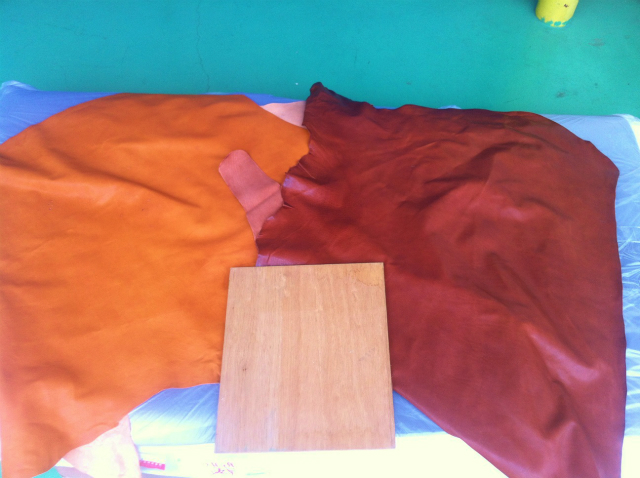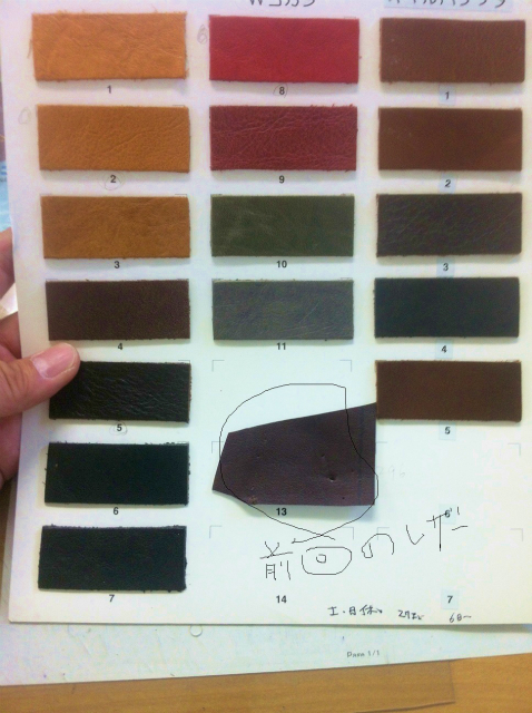 こんな写真を送ってもイメージできるはずもなく、多少独断も入れて2種類の革を仕入れた。どっちがいいだろう、どっちがいいだろうと何度言っただろう。結局、明るいほうならエイジング加工ができるだろうと言う事で左の革に決定。