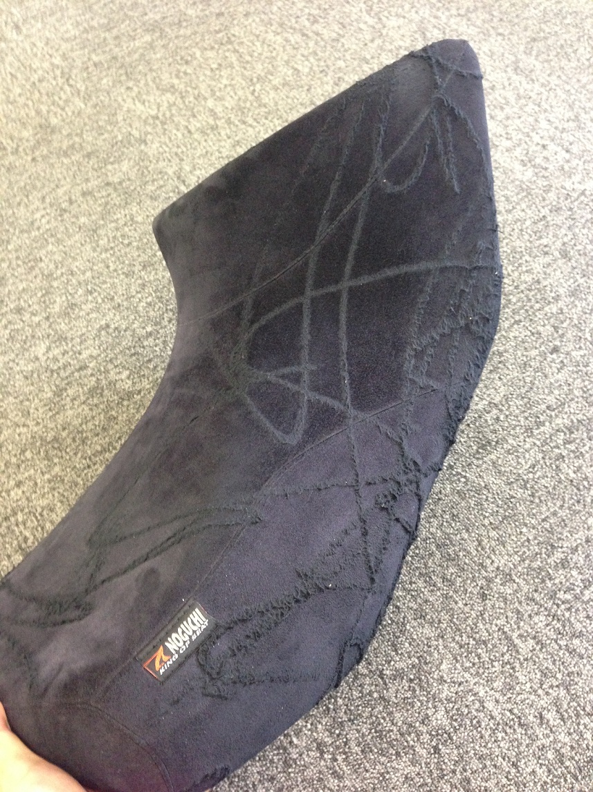 ある方がバイクを貸して、借りた方が洗車して返してくれたまでは良かったのだけれど、高圧洗車機でブシャァー!!!!しかも至近距離で、高圧洗車のノズルはたぶん真っ直ぐ噴射・・・そうすると、エクセーヌやアルカンターラの表面はこのようになってしまいます。もう直りません。張替です。