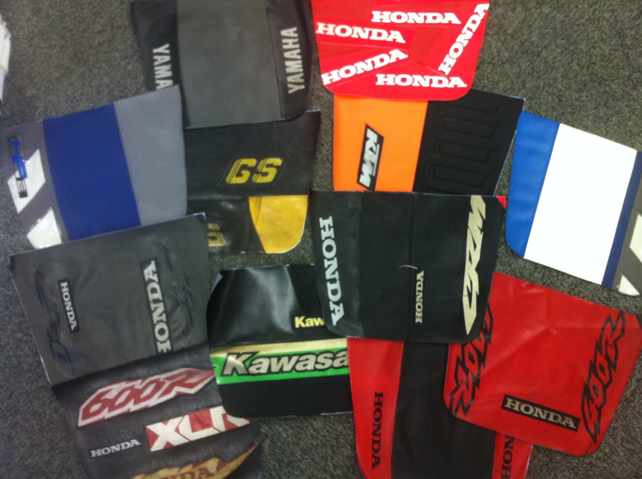 バイクのシートの張替が入ってくると、ロゴ入りのシートカバーはとりあえず全て捨てずに保管しています。
