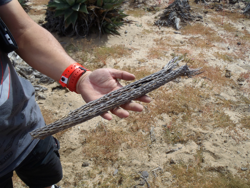 サボテンの抜け殻です。抜け殻と言う言い方はおかしいですが、ニョッキリ伸びたサボテンが枯れると水分が飛んでこれが残ります。これもかなり硬いものです。これの太いのもあって、中にLEDなどを入れて照明器具にすることもあるそうです。途中でピックアップの荷台に直径30cmくらいのこれを積んでるのを見たので、持って帰って何か作るんだろうなって思いました。
