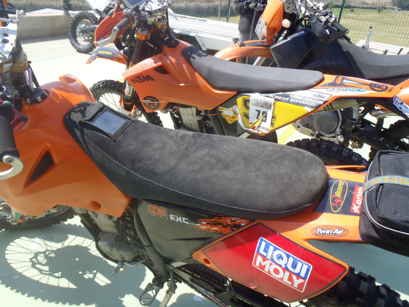 2010KTM530EXCの純正シートをベースにT-NETを全体的に挿入し、弾力あるウレタンでアンコ盛りをした。アンコ盛りの量は低いところで15mmアップ。シート後方の厚みの差はノーマルと殆どありません。シート幅は、あえて格好を優先して10mm広げた程度。実車に装着してまたがると、185cmの身長の私でかかとが少し浮く程度でした。