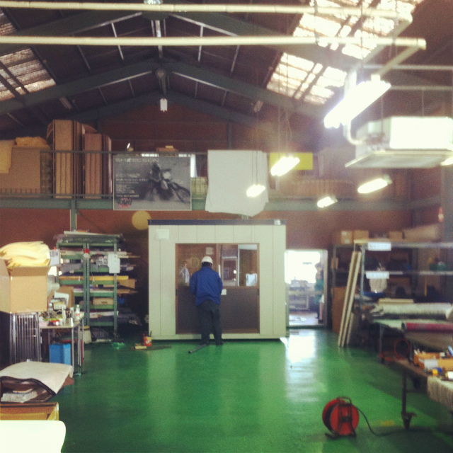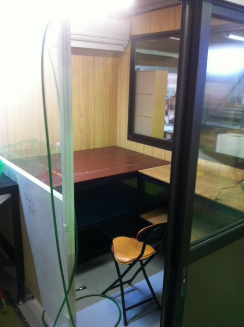 ブースにぴったりと合わせた作業台を特注した。こちらの台では糊付けや型取り作業などを行います。エアコンも取り付けました。温度と品質は比例すると勝手に思っています。