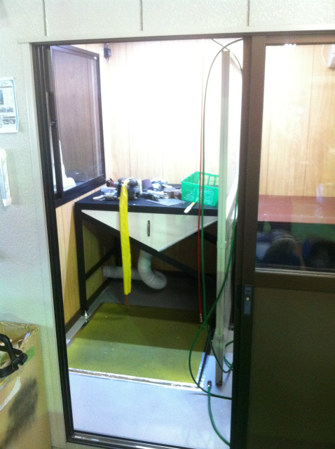こっちが今回の目玉。ウレタン削り台。粉が舞わないようにどんどん吸い取ってくれます。スイッチ類は全て手元に設置して、エアツールのソケットは全て天井に這わせたので、ホースやコードが足元を邪魔することはありません。