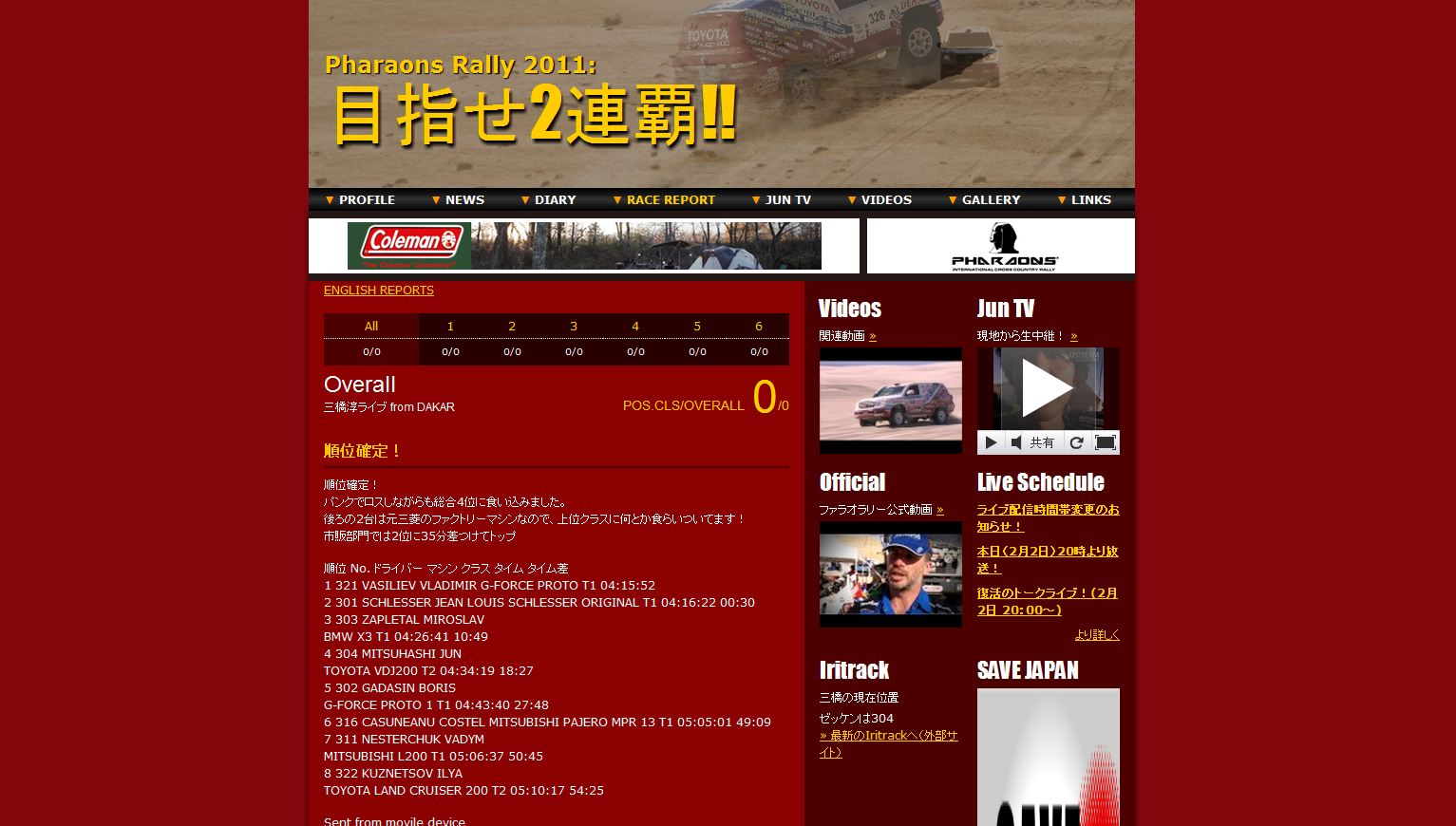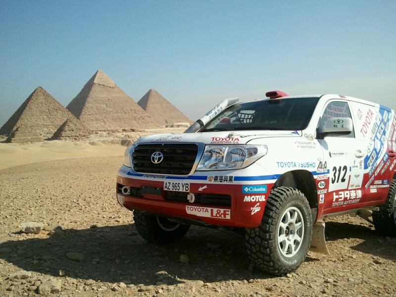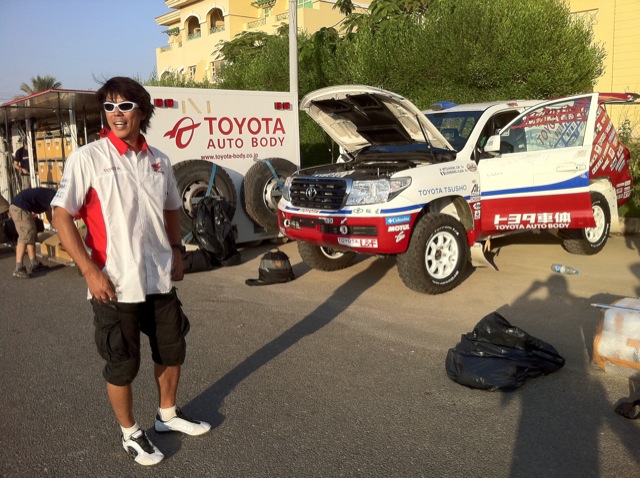 じゃぁ優勝目指すならそのレーシングマシンに乗ればいいじゃない、と思うのは当たり前なんだけど 、レーシングドライバー潤沢な資金があれば自分でマシンを用意して勝ちを狙えるが、そうはできないのが現状。だから現在所属するチームの方針のなかでドライバーが頑張るしかないんだ。チームランドクルーザーはあくまでも市販車クラス連覇を狙う。それはランドクルーザーの市販状態でのポテンシャルの高さを世間に知らしめるためだ。しかし、ドライバーはその任務を負いつつ自分の可能性も追わなければならない。本当ならもう少しアクセルを緩めて安全な方法も取れるはず。総合優勝ができる かも しれない可能性にかける三橋淳とランドクルーザー。ダカールの前哨戦でもあるこのファラオラリーで、世界の注目を集めてもらいたい。