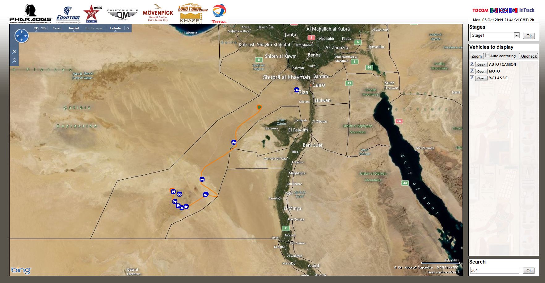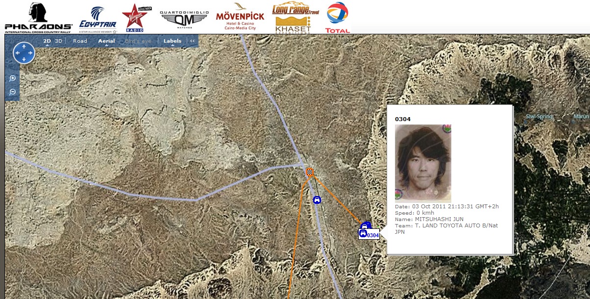 ファラオラリーはライブで三橋淳と2号車の寺田選手(№312)の位置が確認できます。車に積んであるIriTrackという機械で前車が補足されています。止まっていたり、おかしなところに行くと主催者からその機械を通して連絡が入ります。