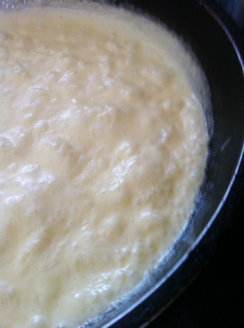 自分で香りが立ったと判断した時点で生クリームを規定量きっちり投入。そしてその量が2/3になるまでコトコトコトコト。2/3になるまで煮詰めるのだけど、量りにかけることもできず、見ながら少し減ったかなと思ったら良しとしよう。これもハム以上に焦がしそうな予感。そして、ここにほんの少し塩を入れてソース完成。もう完成?