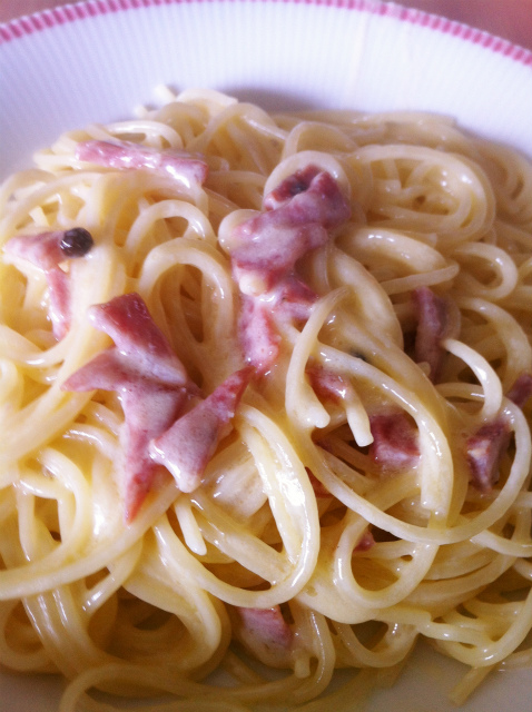 クリームソースのパスタってのを作ったことがなかったのでこれに挑戦。ハムのクリームソース。ソースの材料はハム、生クリーム、無塩バター、サラダ油?(サラダ油なんだ)、塩以上!えーーーっこれだけ??黒コショウとか入れないんだ。書いてあるレシピ通りにやると発見があるから嬉しい。イタリアンならなんでもオリーブオイル入れれば良いでしょ!とかの固定観念が壊れるのが嬉しかったりする。