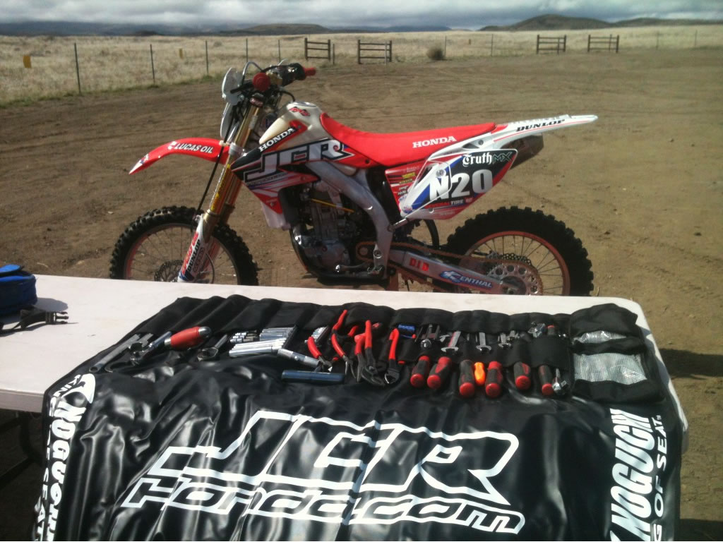 ラリーに行く前に試作した工具巻き。JCR/HONDAのメカニック、エリックが要望した物をアレンジして試作。