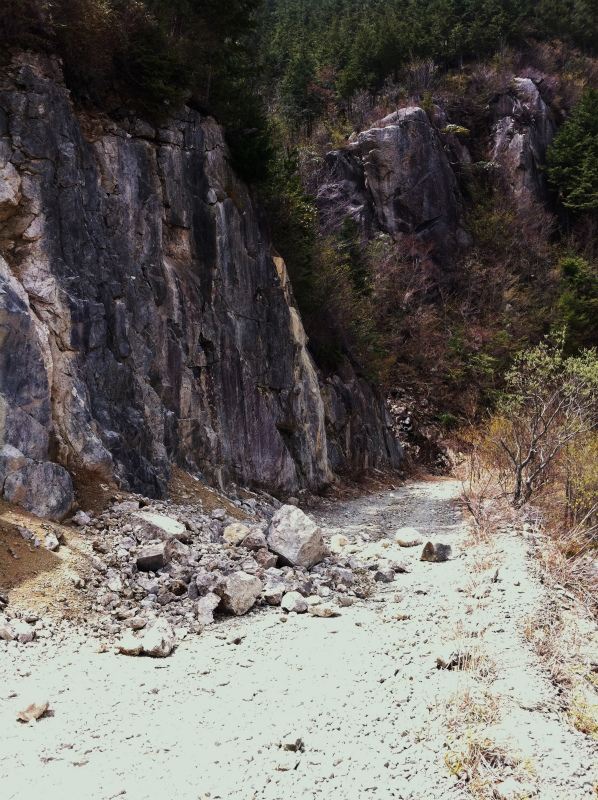 雪がなくなった直後の林道はこのように崩れているところが多くあります。バイクでは問題ありませんが、車だと行けない場所が多くありました。浮いた石にハンドルを取られて危ないこともありましたが、出掛けに転んだおかげで、それ以降は転ぶこともなく気持ちよく山を感じて帰って来れました。