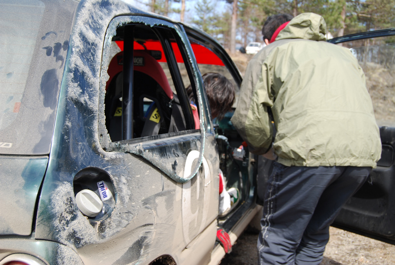 沸騰しきったラジエターの蓋を慎重に開けて水を補充。続いて私のドライブ。とにかく行けーー!と言うことでコースインして走り出すも、路面のギャップとズルズル滑る路面で、おっかないのなんのって、何度か心臓を噛みそうになりました。ほんと車のコントロールは難しいです。しばらくするとBチームがバックミラーに映り込んできました。何とか抜かせまいと頑張って走っていた時です。高速コーナーでインを刺された時に、私の車がインに振られました(はたから見れば、故意に進路妨害をしたように見たでしょう)その瞬間、あっと思ってバックミラーを見たら、ミラーにBチームのヴィヴィオが激しく回転している姿が見えました・・・・・・・・・・・・ごめんよーーーー。ブロックしたんじゃないんだ。結果的にはそんな動きになってしまったけど、悪気はないんだ。幸いドライバーに怪我もなくヴィヴィオもまだ走れる状態。応急処置をして走り続けます。