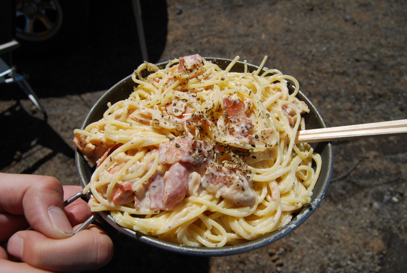 それでも、なんとか周回を重ねるトゥデイ号。レースが半分消化され、お昼タイム。毎回恒例の池町シェフが作るパスタ。今回は簡単ホワイトソースのパスタでした。コレがすごく美味しいんです。