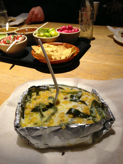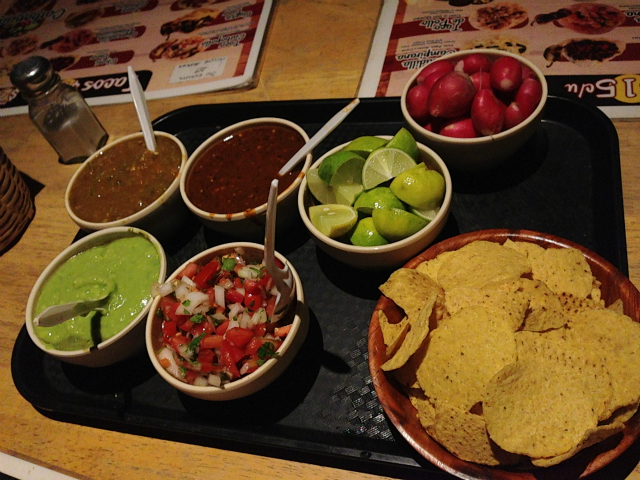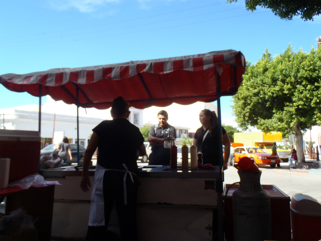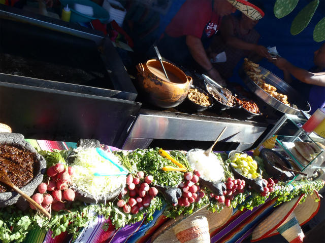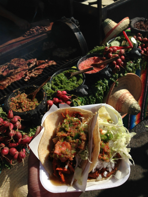 タコスの屋台。トルティーヤに肉を挟んで渡されて、後は好きなトッピングを自分乗せます。