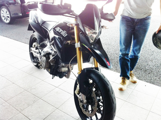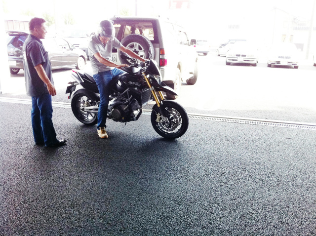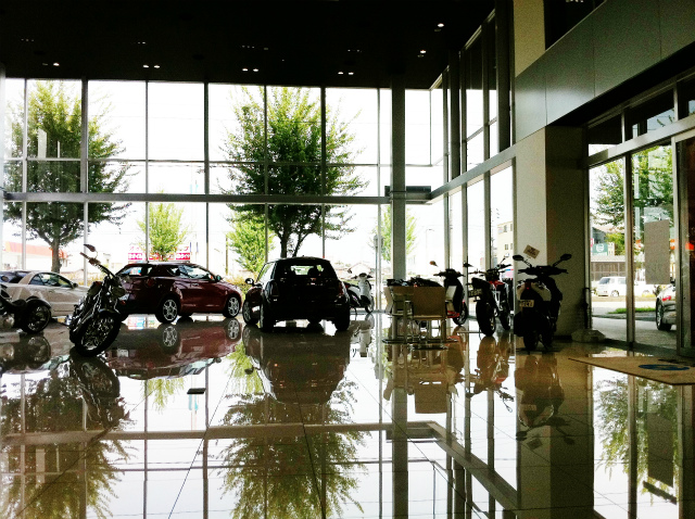 床が水を張ったような輝きです。フェラーリとか置いてあります。正直、勢いで入ってみました。見たことがないアメリカのクルーザーや電動バイク。この会社オリジナルという125から250のロードバイクなどなどがありました。どれも試乗可能ですと言うことだったので、アプリリアの750に乗らせてもらいました。
