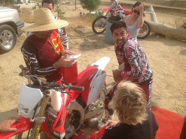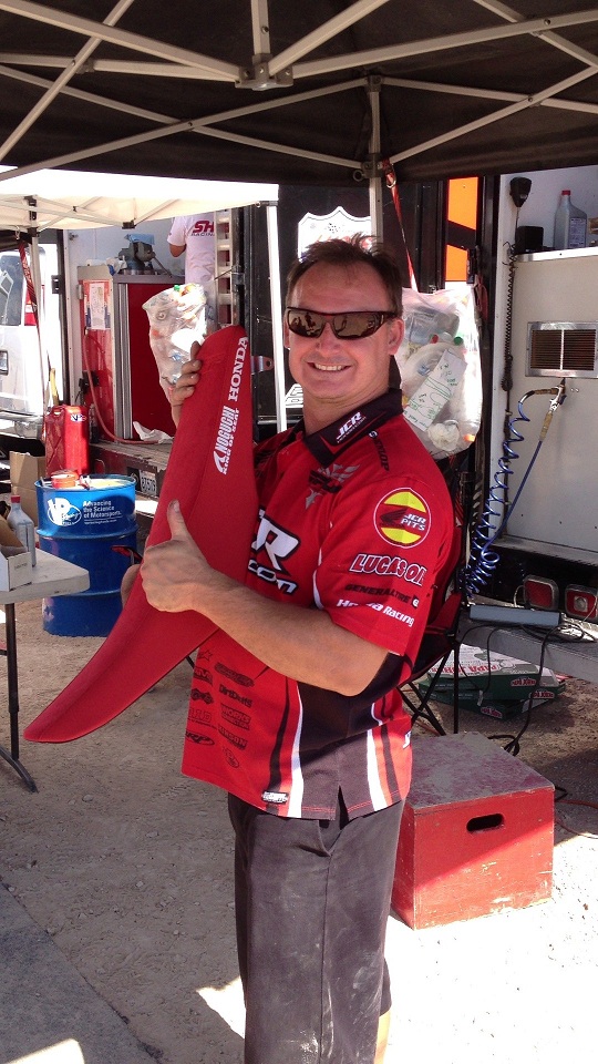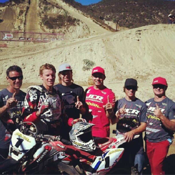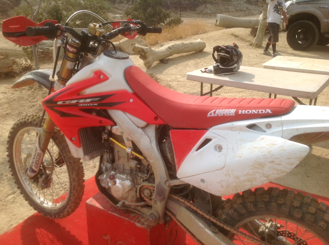 いいですね。CRF450X ゼッケン1の優勝したマシンを前に全員で1番のサイン。そしてその優勝したマシンにはノグチシートが装着されている。