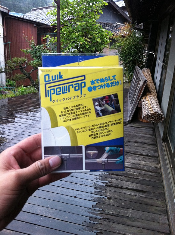 主に配管の水漏れなどに使います。私の場合は、耐熱260度ということもあり試しにカマドの煙突に巻いてみました。使い方はすごく簡単。付属の手袋をはめてテープを水に数十秒浸します。それを巻きたいパイプにテンションをかけながら巻いていきます。若干伸びのあるテープなのでしっかりきつく巻くことができます。巻き終えたら柔らかくなっている樹脂がなじむようにテープ表面をなでます。