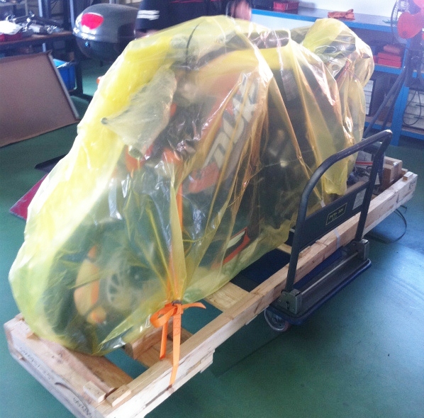 オフロードレースを始めた時から、ラリー出場の時も、普段のバイクの面倒も、いつもお世話になっているのが「バイクショップ TRY」です。先日お店の前を通ったら大きな箱が数個・・・。