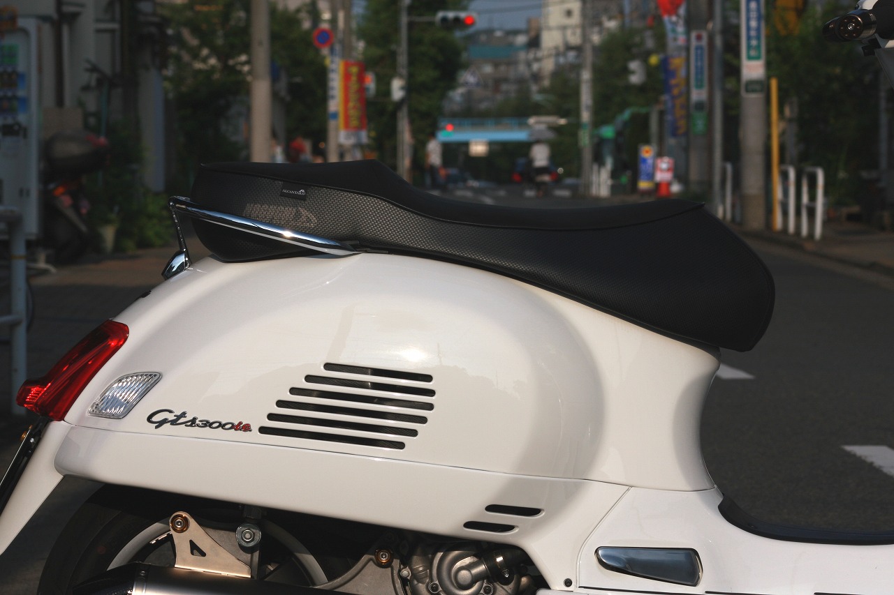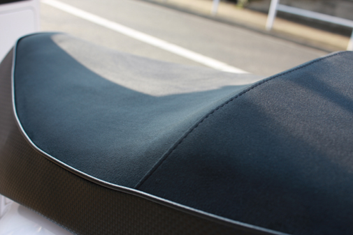 Vespa GTSというベスパの最高級車のシートです。形状変更に合わせてT-NETの挿入とアルカンターラを座面に使い、サイドはカーボン風というお客様の希望で仕上げたシートです。